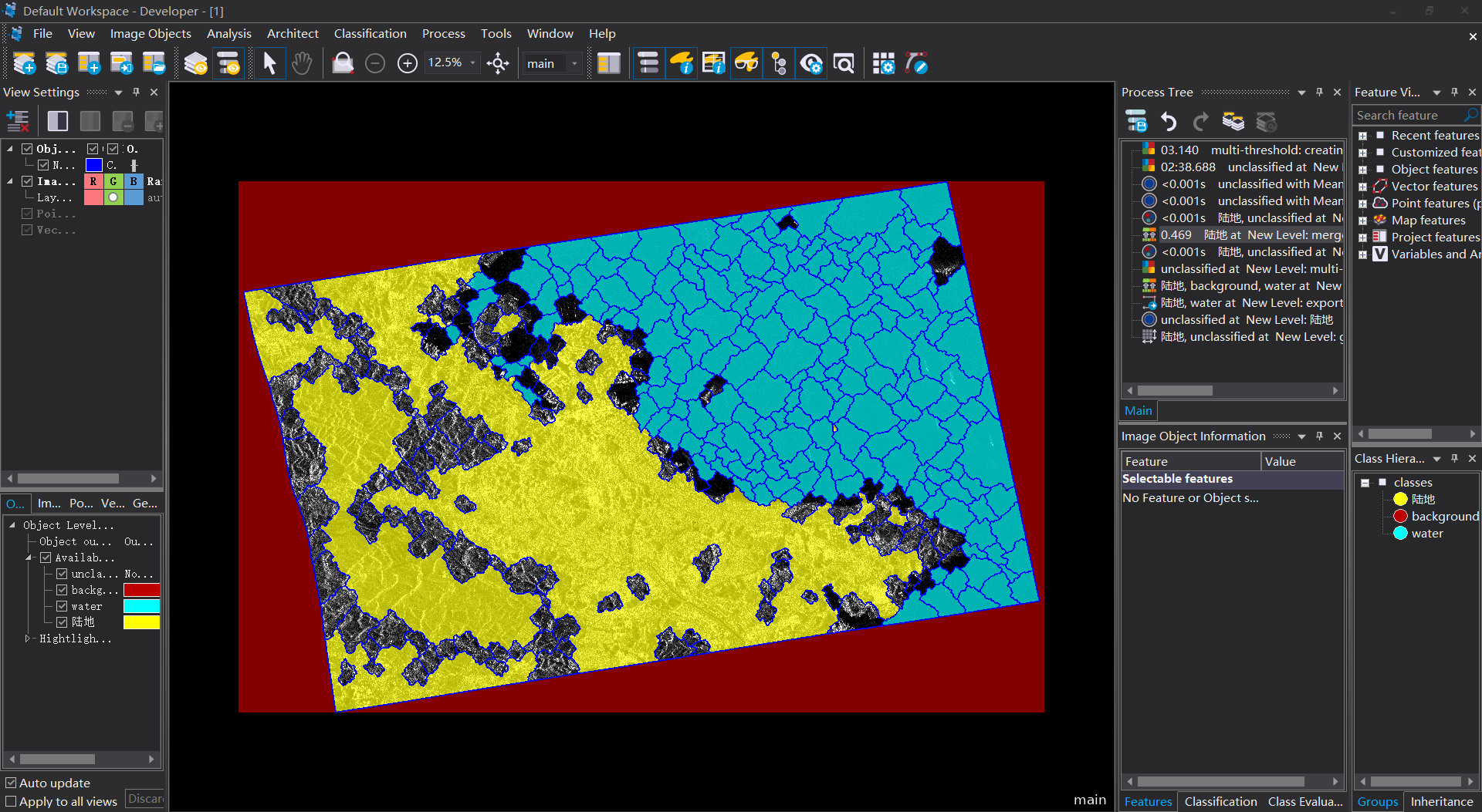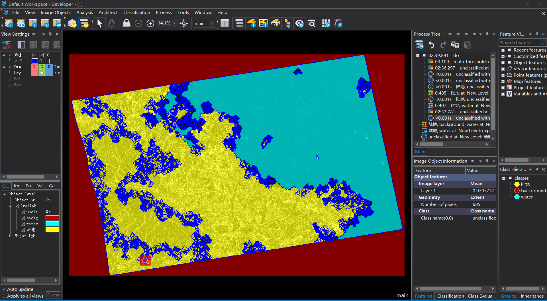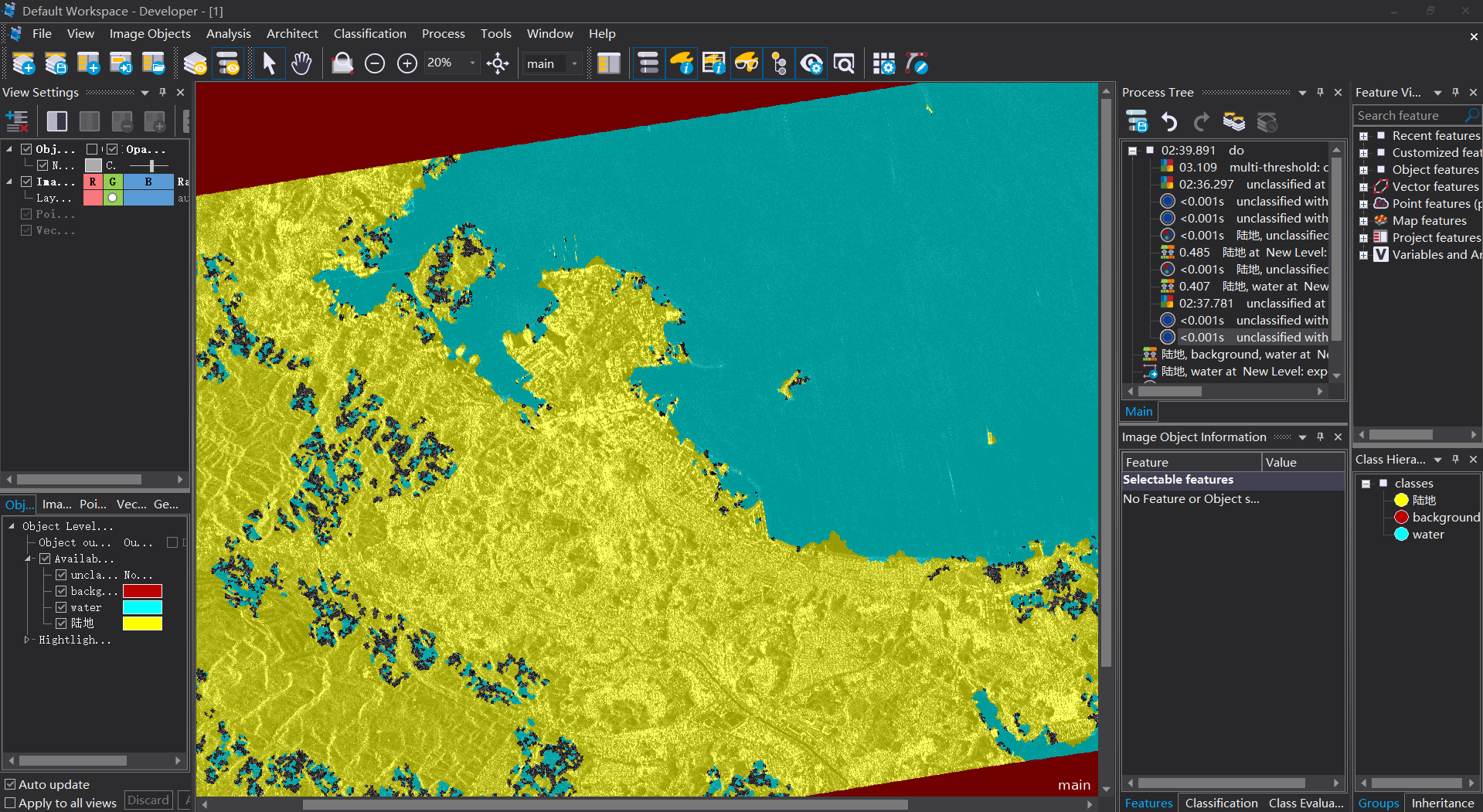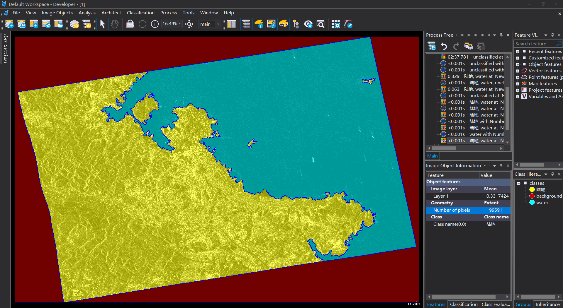 10 進行“陸地”和“水域”與“未分類”之間進行一個簡單的分類去除;再將“陸地”中面積小于5000pixel的土塊分到“水域”中/合並;將“水域”中面積小于5000的土塊分到“陸地”中/合並