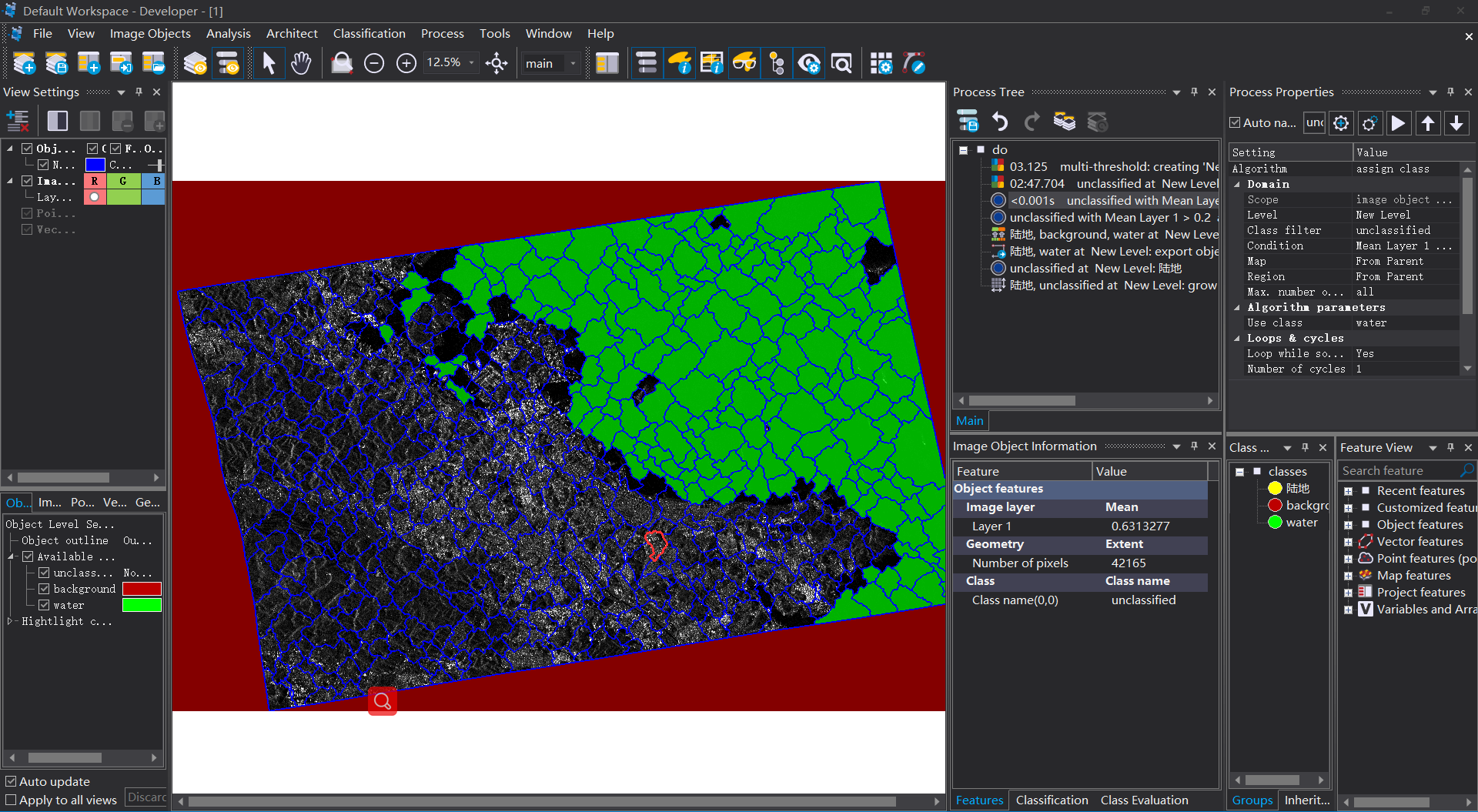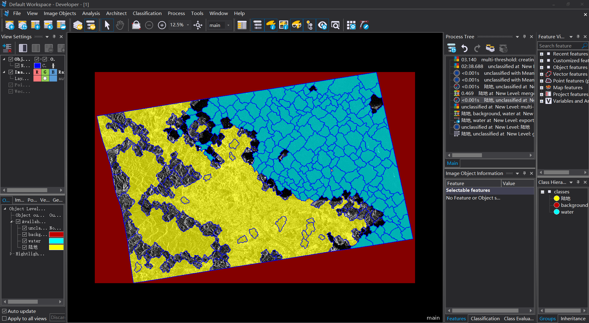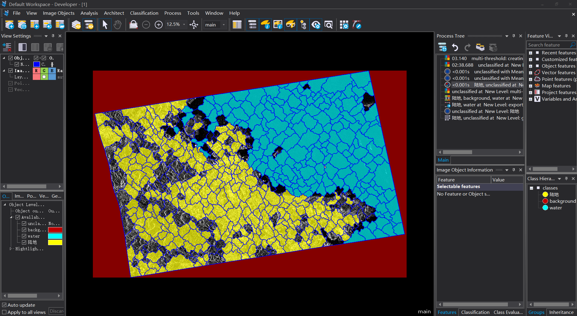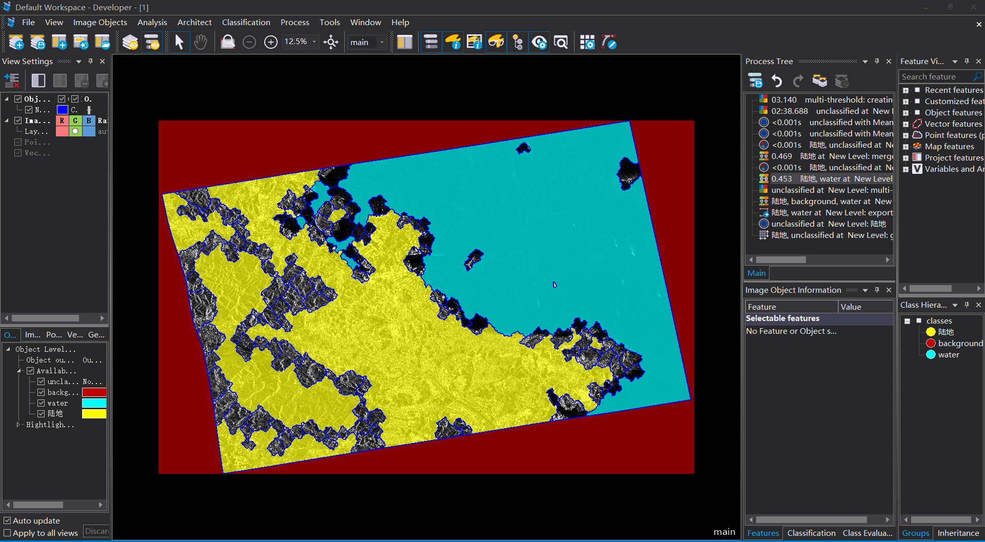 10 進行“陸地”和“水域”與“未分類”之間進行一個簡單的分類去除;再將“陸地”中面積小于5000pixel的土塊分到“水域”中/合並;將“水域”中面積小于5000的土塊分到“陸地”中/合並